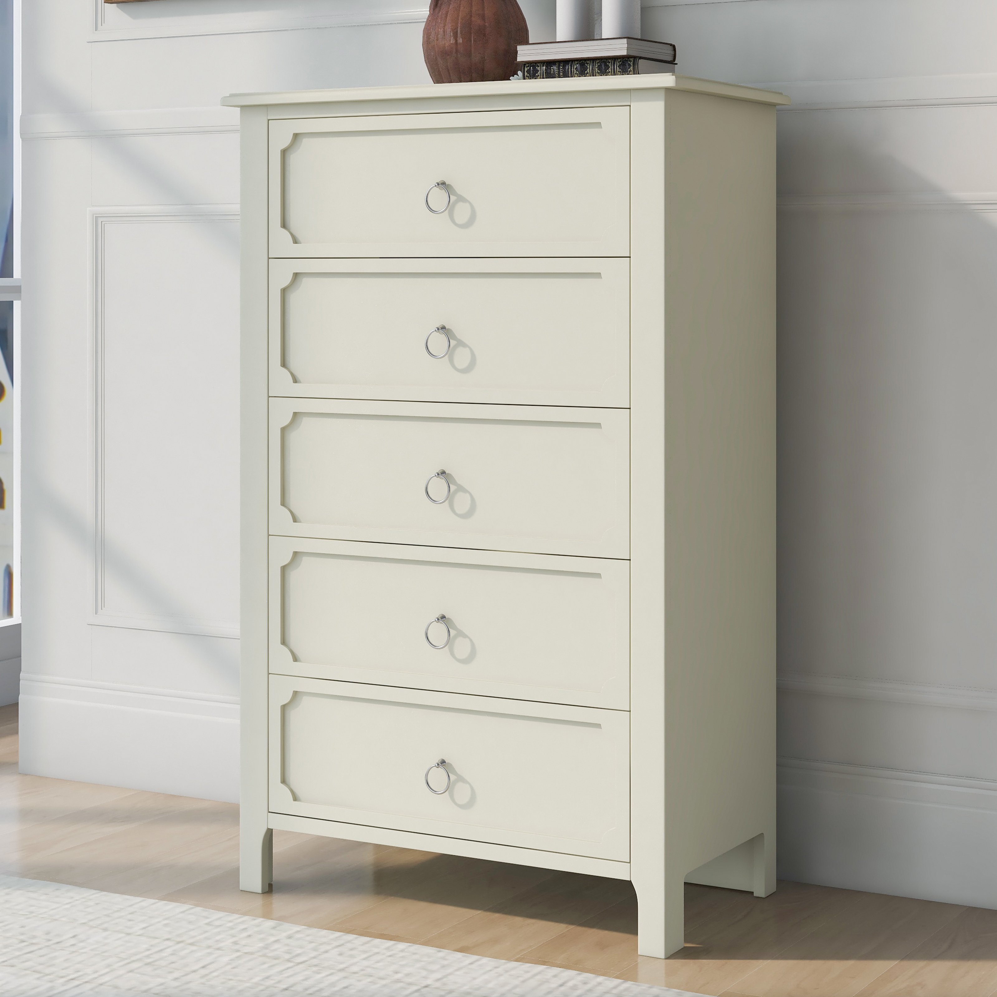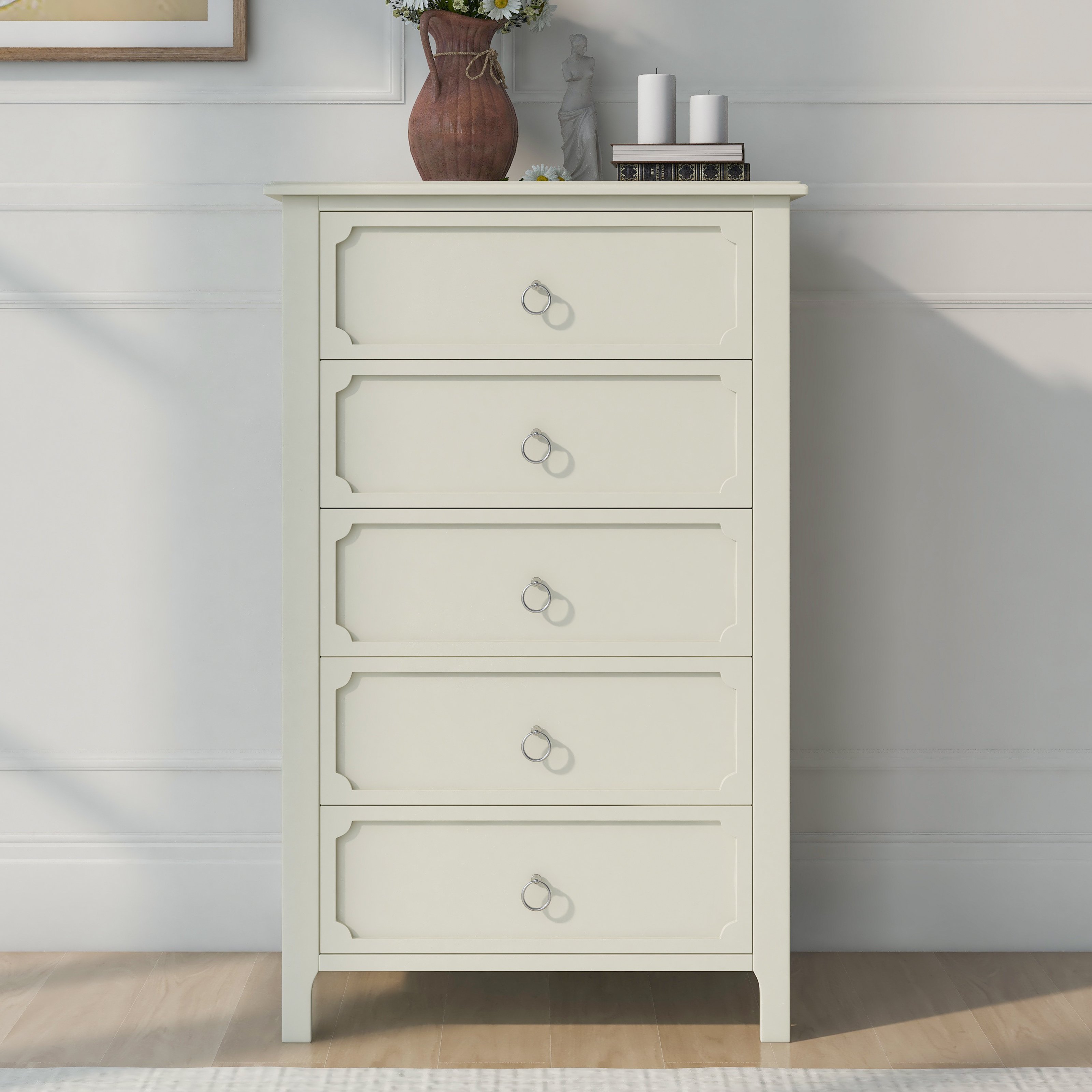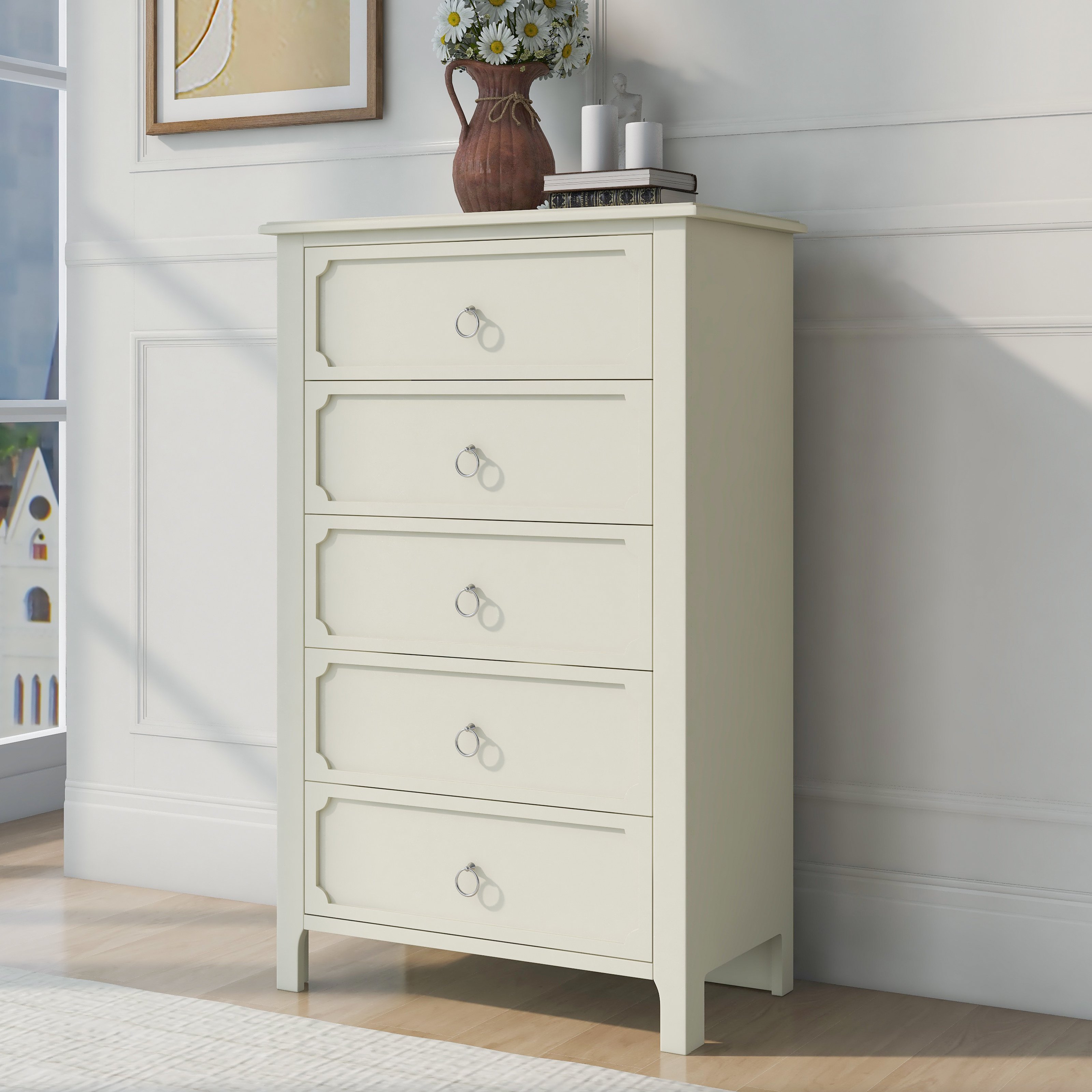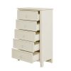 Classical StyleWith simple and clean lines; the design of this classical style milky white chest does away with the complex and gorgeous lines; presenting a fresh and elegant temperament. The groove pattern on the five drawer front plates combines curved and straight bars to enhance the artistic feel of the overall product. It's also very watchable. High-quality MaterialsThe main structure of this milky white chest is manufactured of solid rubber wood to guarantee the stability and load-bearing capacity in long time usage. These drawer slides of this chest are made of rubber wood as well for the same reason. Other parts of this chest are made of MDF board to ensure durability. Surface of this chest after spray paint treatment; feel smooth and easy to clean. Ample Storage SpaceAll the space in the whole chest is designed as drawers; offering a lot of storage spaces. The space is divided into five large drawers; all of which can be used as storage space for everyday clothes and supplies. The smooth and flat tabletop can be used to place decorations and lamps.Delicate AccessoriesThe design of the overall shape of this milky white wooden chest is simple and elegant; with a certain sense of art. To match the overall effect of this chest; the handles on the five drawers were designed to be small and easy to use. These ring handles are made of silver metal to match the milky white chest to show a graceful appearance. Matching SeriesAs a functional piece of furniture; this wooden chest can be used alone and can be placed in bedrooms; living rooms and guest rooms to meet the storage needs of daily life. A more recommended way to use this product is with other products-bed; nightstand and dressser from the same series. This combination looks more elegant and more powerful.