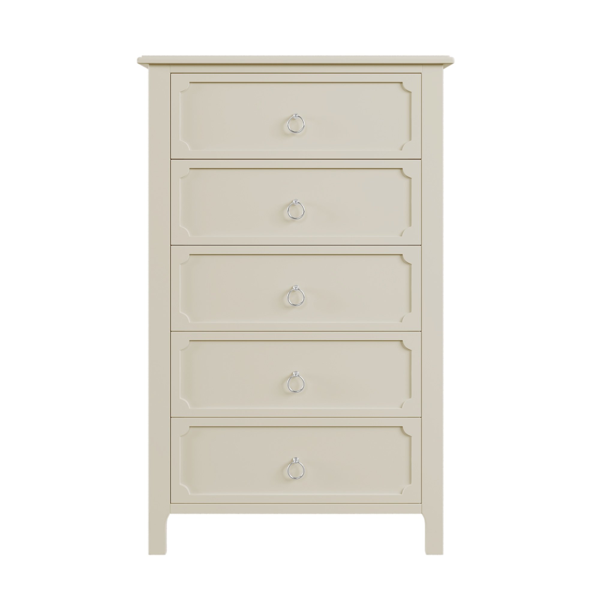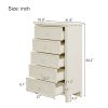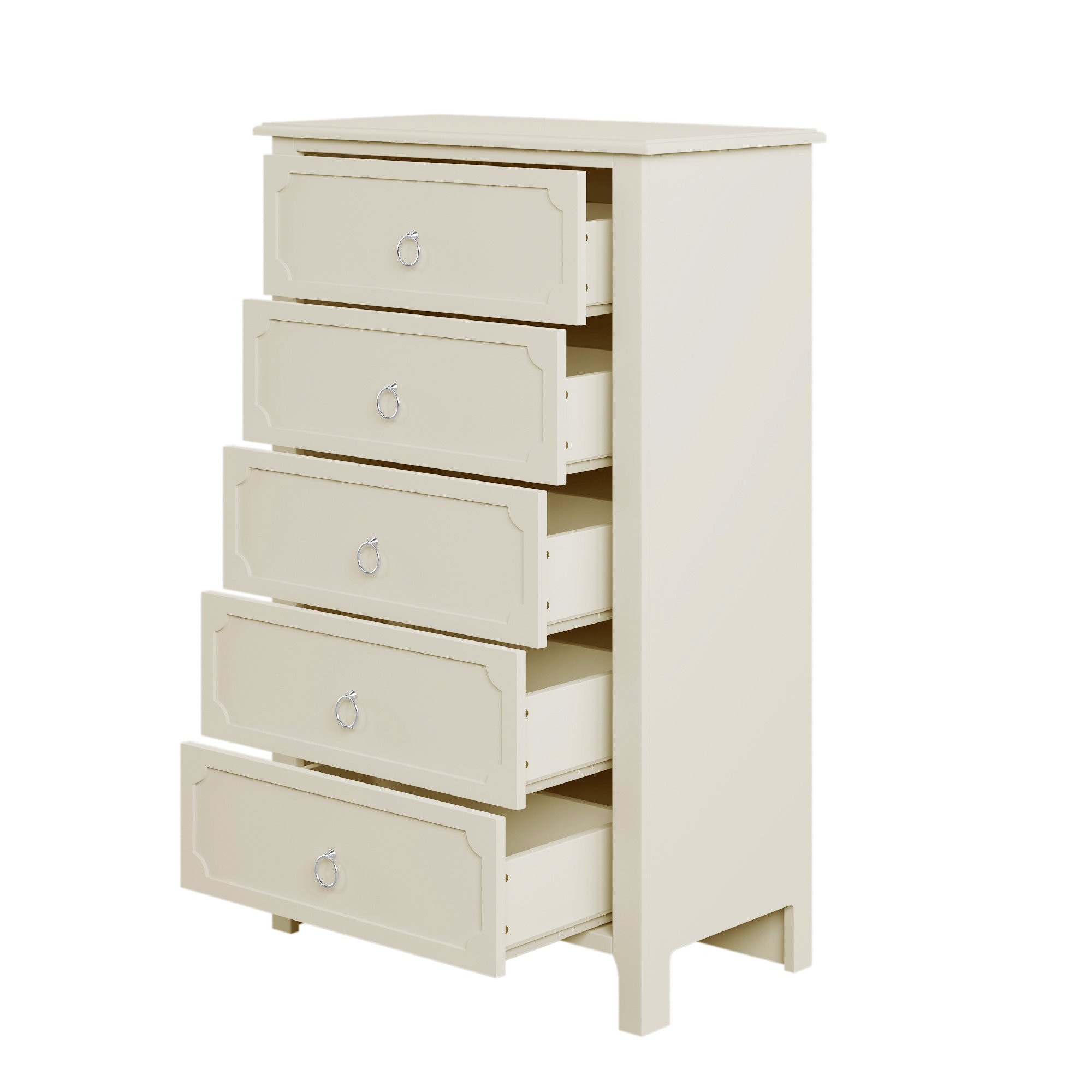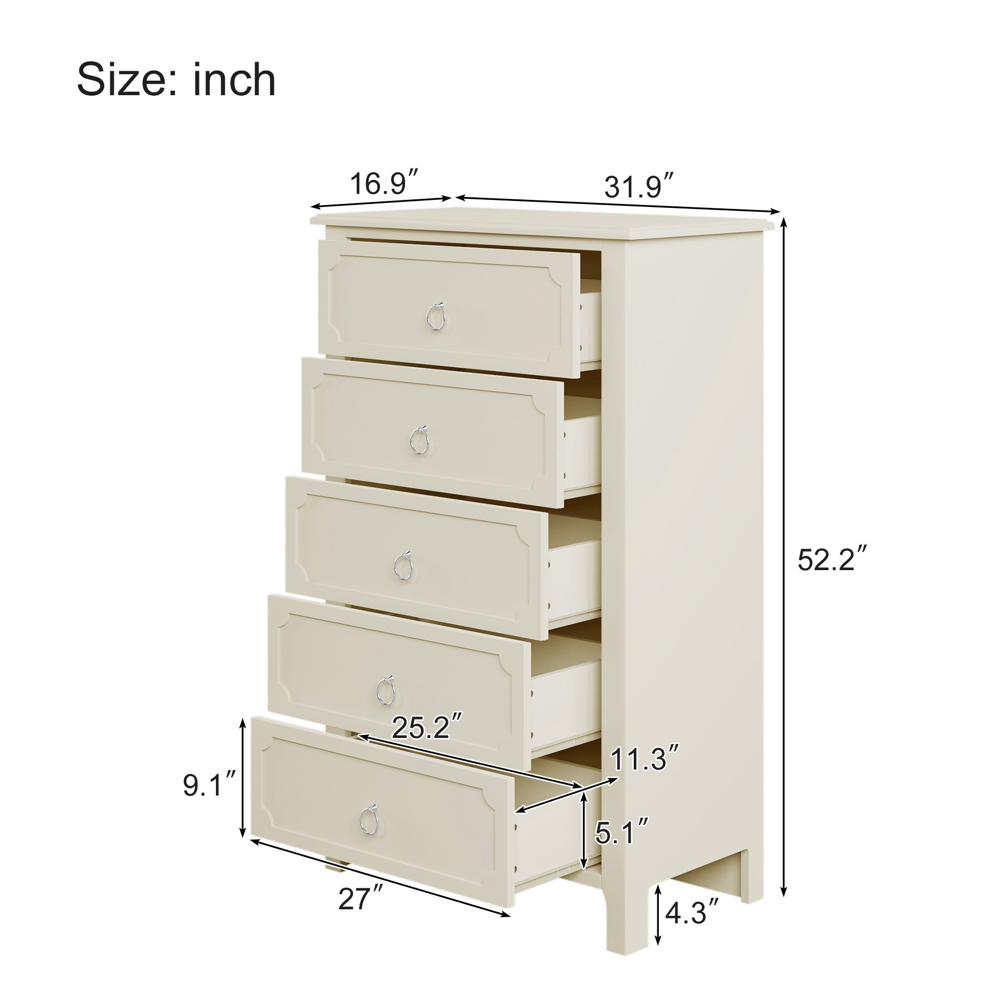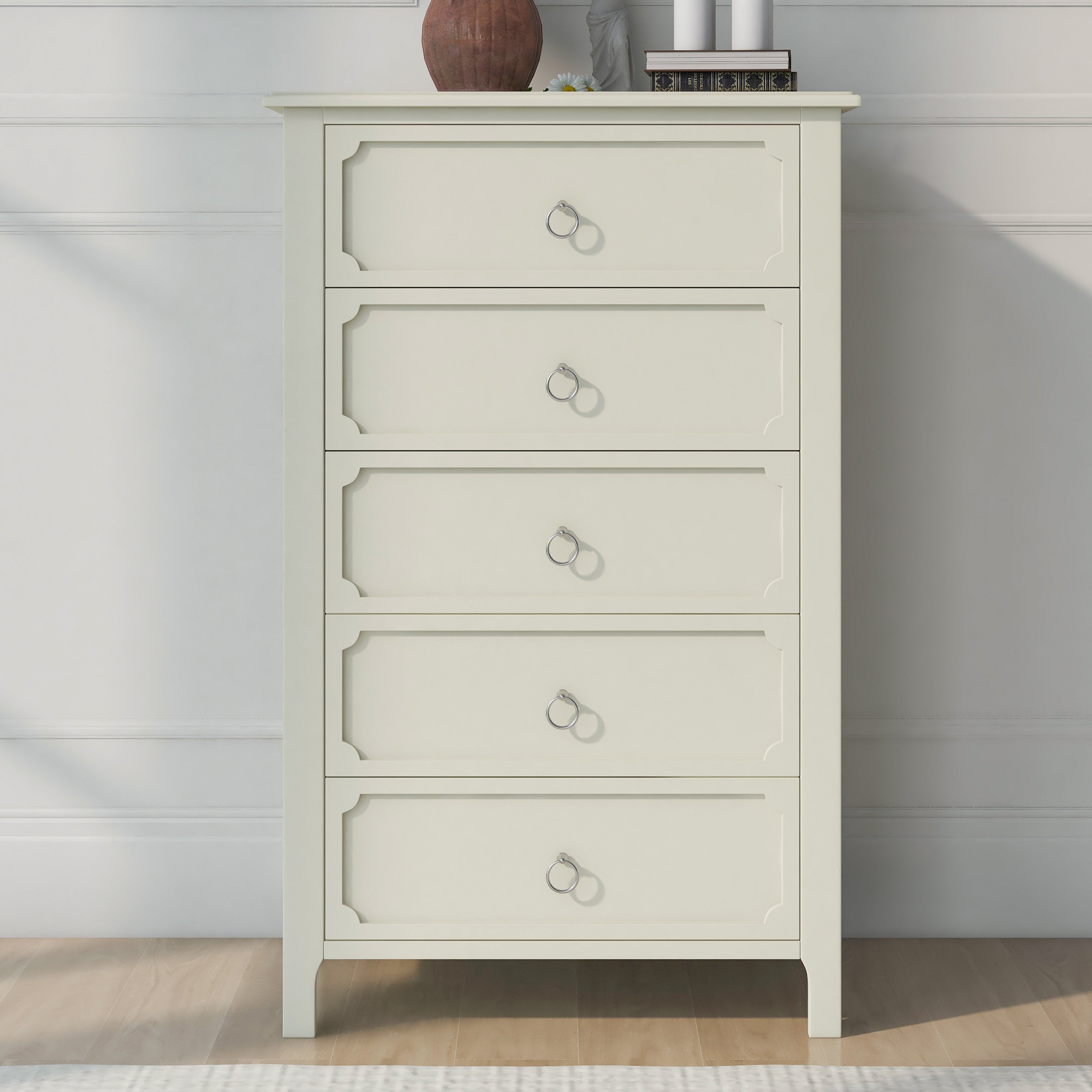 Classical StyleWith simple and clean lines; the design of this classical style milky white chest does away with the complex and gorgeous lines; presenting a fresh and elegant temperament. The groove pattern on the five drawer front plates combines curved and straight bars to enhance the artistic feel of the overall product. It's also very watchable. High-quality MaterialsThe main structure of this milky white chest is manufactured of solid rubber wood to guarantee the stability and load-bearing capacity in long time usage. These drawer slides of this chest are made of rubber wood as well for the same reason. Other parts of this chest are made of MDF board to ensure durability. Surface of this chest after spray paint treatment; feel smooth and easy to clean. Ample Storage SpaceAll the space in the whole chest is designed as drawers; offering a lot of storage spaces. The space is divided into five large drawers; all of which can be used as storage space for everyday clothes and supplies. The smooth and flat tabletop can be used to place decorations and lamps.Delicate AccessoriesThe design of the overall shape of this milky white wooden chest is simple and elegant; with a certain sense of art. To match the overall effect of this chest; the handles on the five drawers were designed to be small and easy to use. These ring handles are made of silver metal to match the milky white chest to show a graceful appearance. Matching SeriesAs a functional piece of furniture; this wooden chest can be used alone and can be placed in bedrooms; living rooms and guest rooms to meet the storage needs of daily life. A more recommended way to use this product is with other products-bed; nightstand and dressser from the same series. This combination looks more elegant and more powerful.