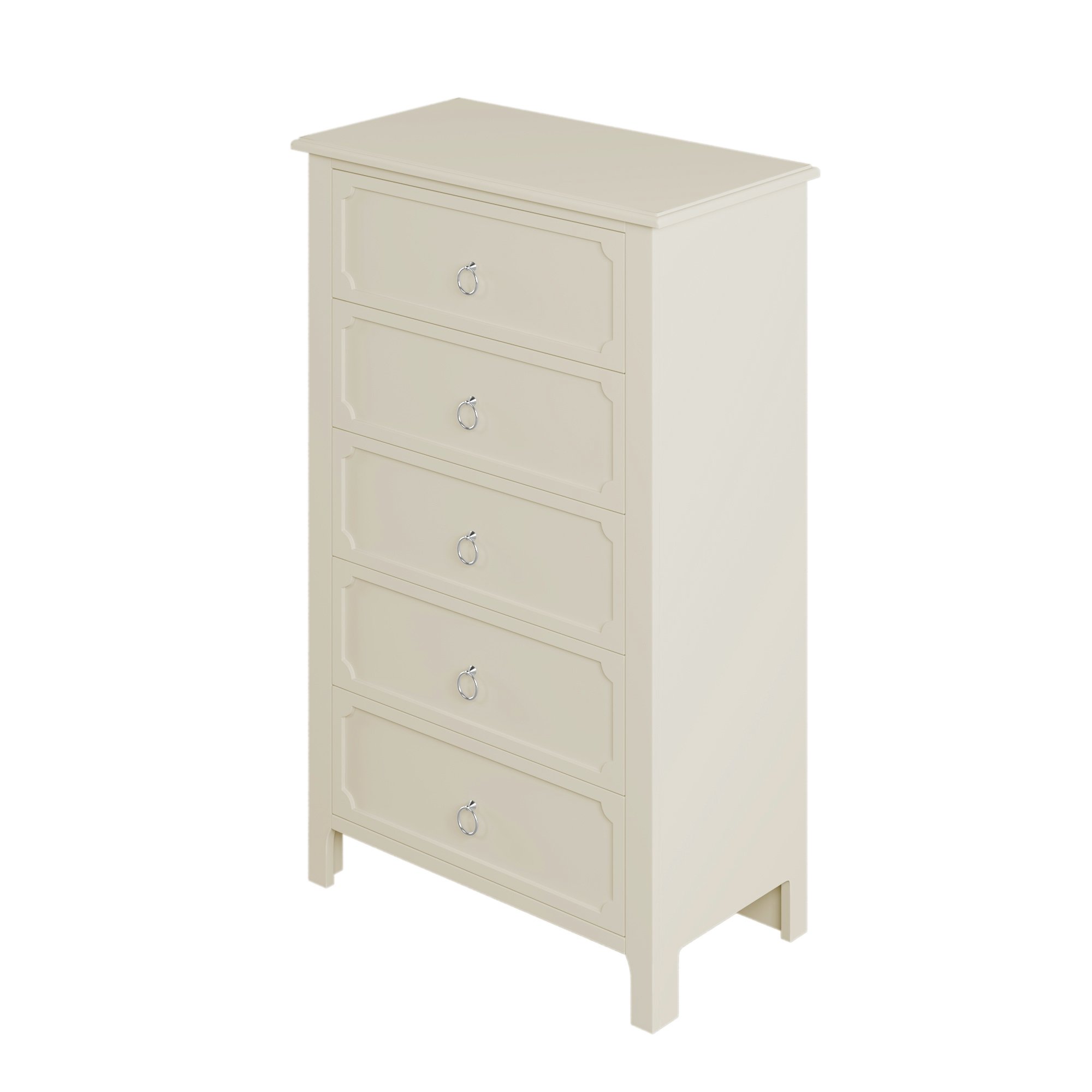 This piece of furniture has clean and simple lines; yet presents an elegant overall shape. This milky white rubber wooden chest offers ample spaces to meet the storage requirements in daily life. Five large drawers with silver ring handles are powerful and easy to pull; and the grooved drawer front plate are artistic. Selected solid rubber wood used as the main frame of this chest that can guarantee the stability and durability during usage period. From bedroom to living room; or guest room; this chest can be used as a powerful functional storage furniture. At the same time; we also recommend other furniture products in the same series; such as bed; dresser; and bedside table. A room with the same series of furniture; not only beautiful; the actual use of more convenient.